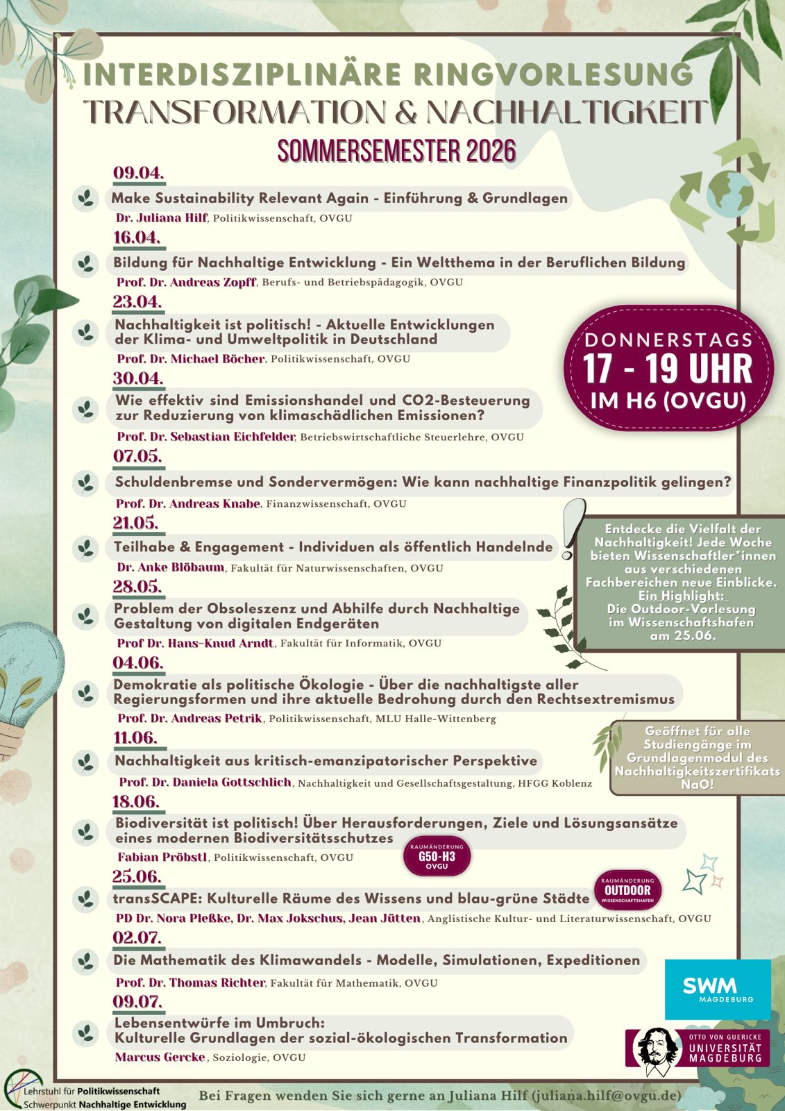 Weitere Informationen über die Ringvorlesung Transformation und Nachhaltigkeit 2026 sind im LSF der OVGU zu finden.